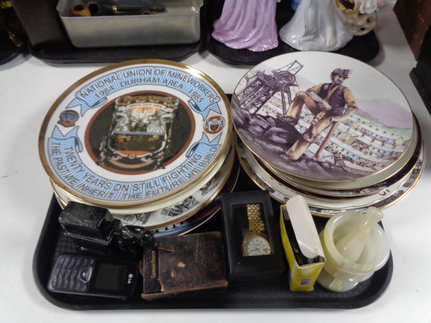 A tray of a quantity of assorted plates relating to mining, mobile phone, gent's wristwatch, prayer book etc