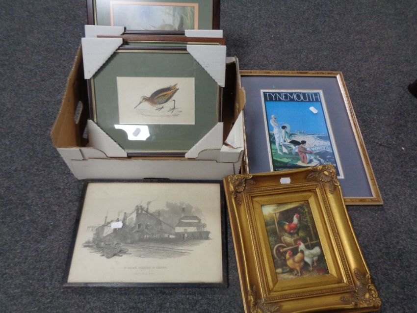 A box containing assorted pictures to include an oil on board, Hens in a yard, signed Hunt, an Alfred Lambert print of Tynemouth etc.