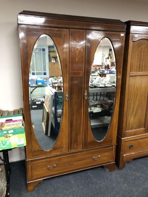 An Edwardian inlaid mahogany double mirror door wardrobe fitted with a drawer