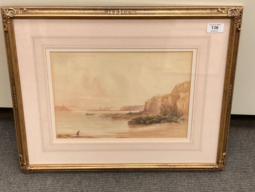 George Pelham Dixon (1859 - 1898) : A Fishing Boat in Calm Waters with Port Beyond, watercolour, signed, dated 1895, 24 cm x 33 cm, together with companion piece also depicting a coastal scene, framed as a pair. (2)