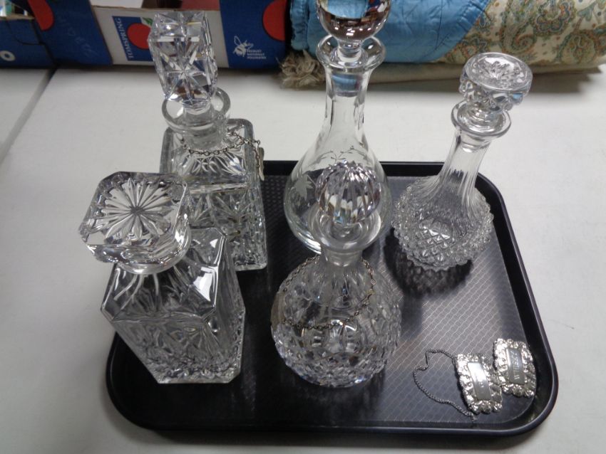 A tray containing five assorted decanters with stoppers to include Rockingham Crystal, four with decanter labels.