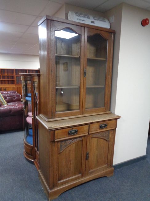 An oak Arts and Crafts double door bookcase, fitted cupboards and drawers beneath.