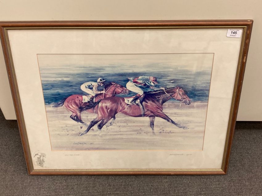 After Keith Proctor : On the Line, reproduction in colours, signed to the mount in pencil, dated 1990, with pencil remarque, 33 cm x 49 cm, framed.