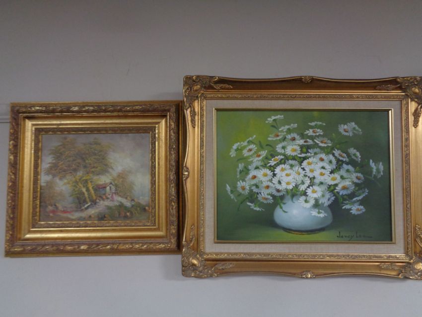 A B Groneman oil on board of a figure by a rural dwelling together with a further oil on canvas still life