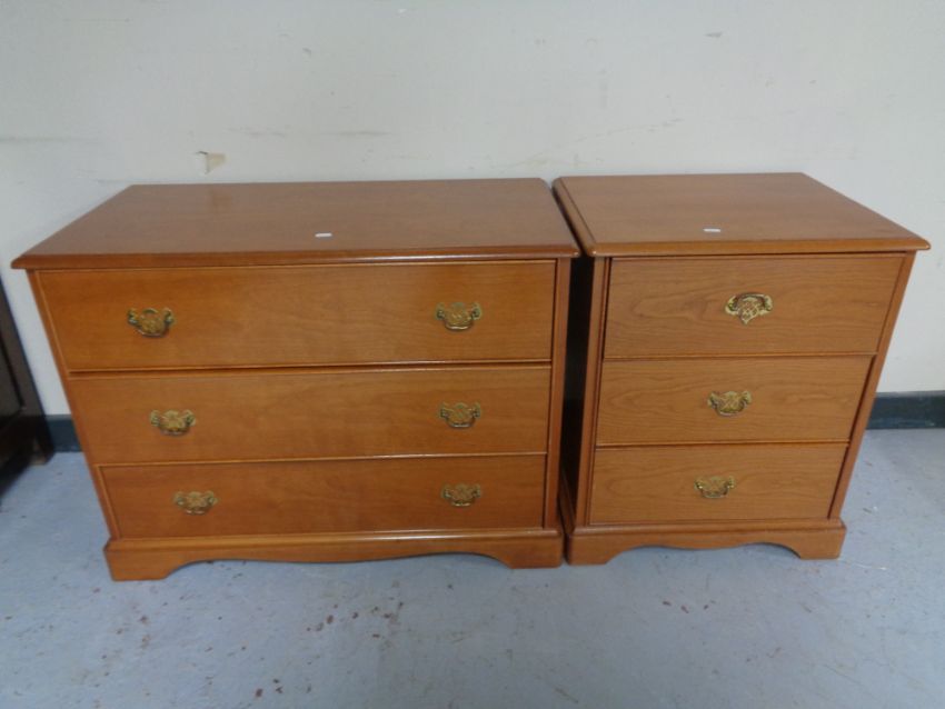 A Stag three drawer chest together with three drawer bedside chest in teak finish