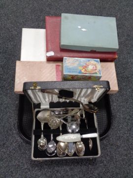A tray of assorted boxed cutlery sets, crested spoons, baby spoon etc
