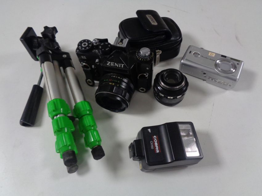 A tray of cameras to include a Zenit 11, Canon Powershot together with lens, flash and tripod