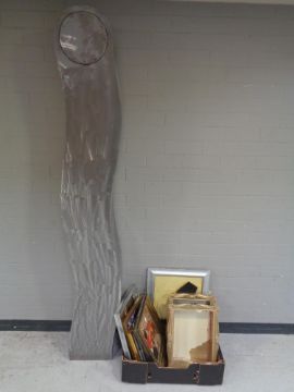 A box of assorted framed pictures to include erotic studies, two gilt box frames together with a contemporary metal electric longcase clock (a/f)