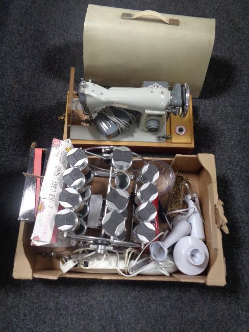 A cased Jones electric sewing machine together with a box containing kitchen electricals, spice rack etc