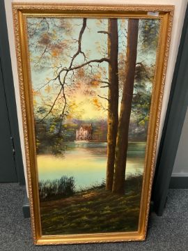 Twentieth Century School : Lake Scene with Fortified Dwelling Beyond, oil on canvas, indistinctly signed, 94 cm x 44 cm, framed.