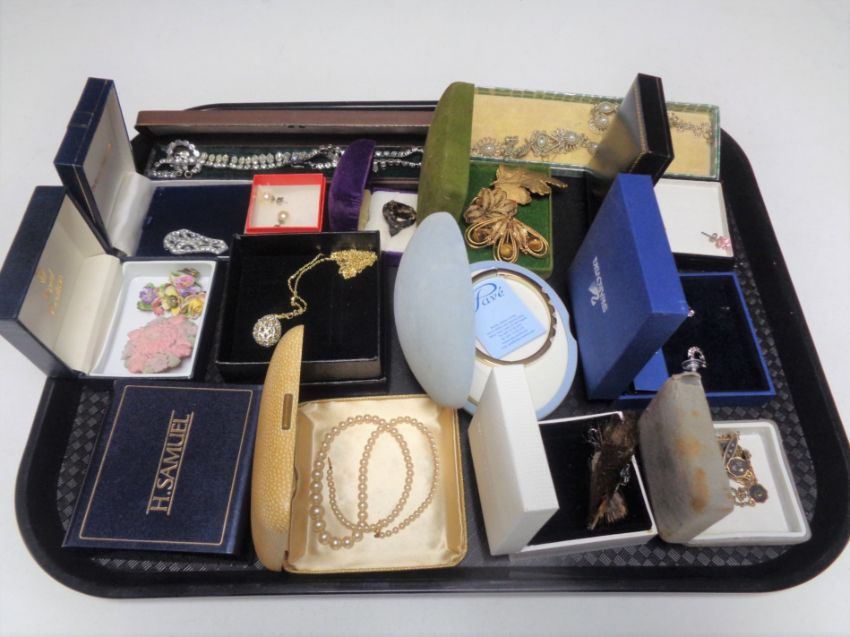 A tray of costume jewellery to include Swarovski earrings, ceramic brooches, pendants on chains etc