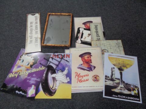 A box containing faux bamboo framed mirror, metal advertising signs etc