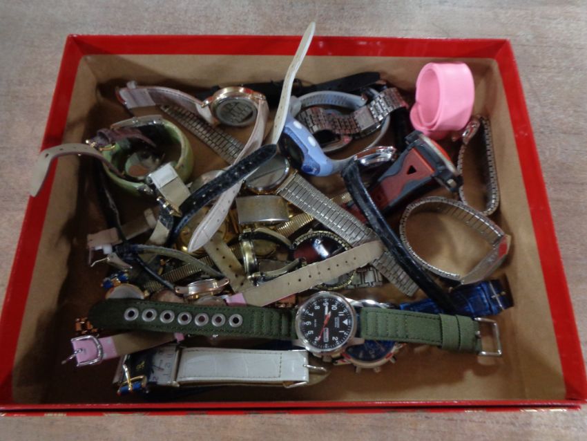A box of lady's and gent's wrist watches including Timex, Citizen etc