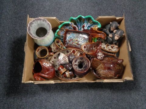 A box containing assorted Studio pottery.