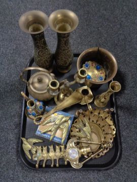 A tray containing assorted brass ware to include Eastern brass vases, two way candlestick, coat hooks etc.