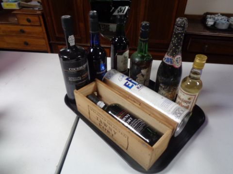 A tray containing eight bottles of alcohol to include Tawny Port in wooden case, Harvey's Bristol Cream, Lindisfarne Mead etc.