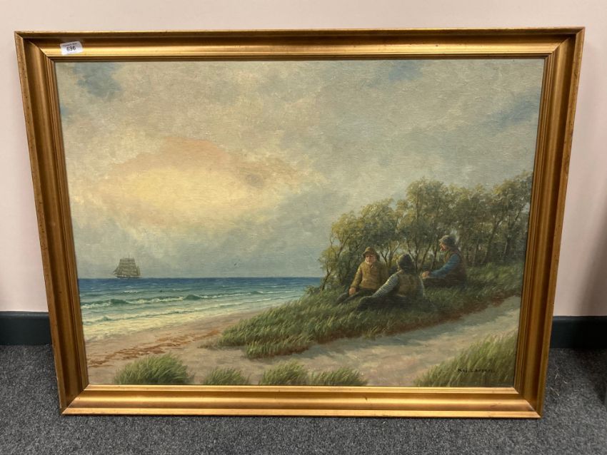 Continental school : Three figures on a beach, oil on canvas, indistinctly signed, 87 cm x 65 cm
