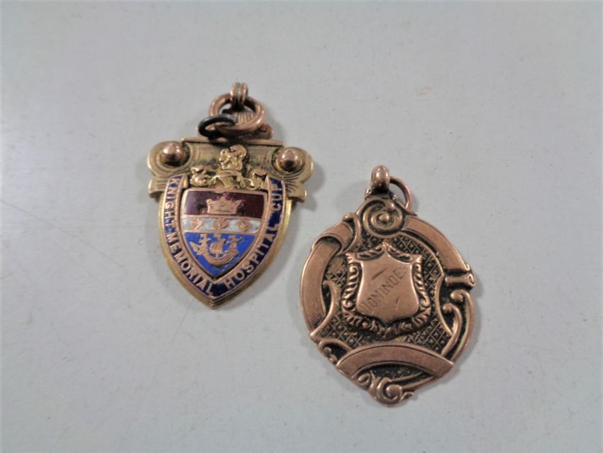 A 9ct gold 1926/27 Knight Memorial Cup medal and a further 9ct gold fob, 13.6g.