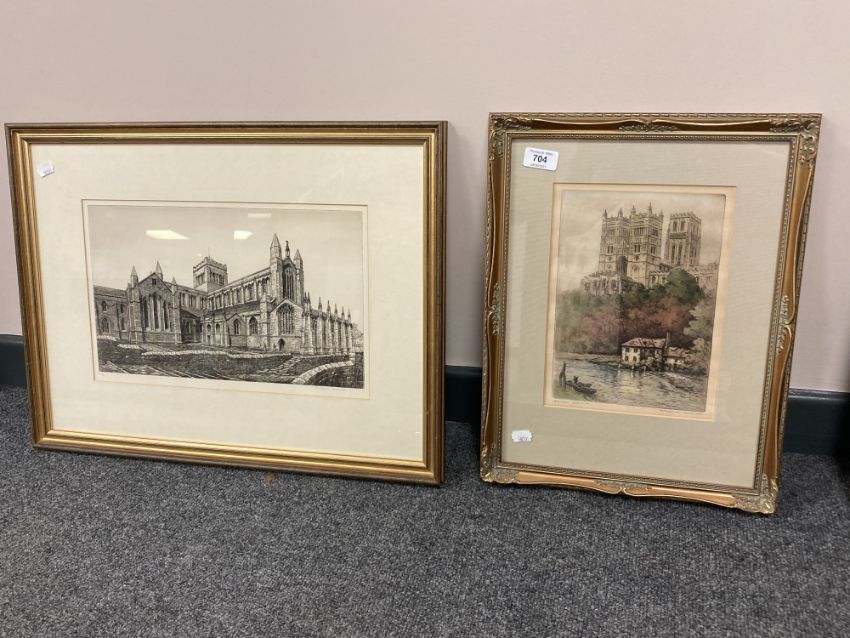 A hand coloured etching depicting Durham Cathedral, together with a further print by R. Nevill Haddock. (2) 20 cm x 27 cm