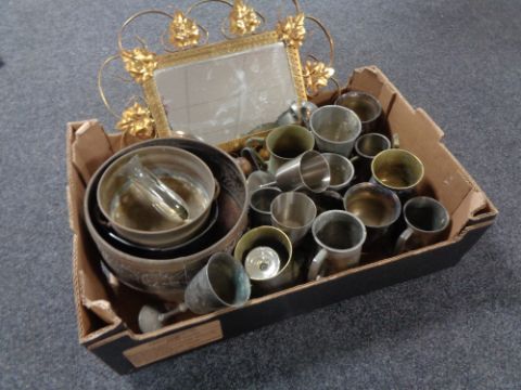 A box containing assorted metal ware to include planters, goblets, brass framed mirror.
