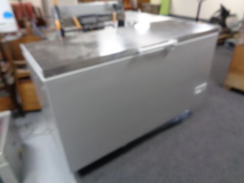 A stainless steel topped chest freezer, width 156 cm.