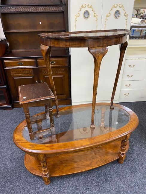 An oval glass topped coffee table together with a walnut pie crust edge D-shaped table and one further occasional table
