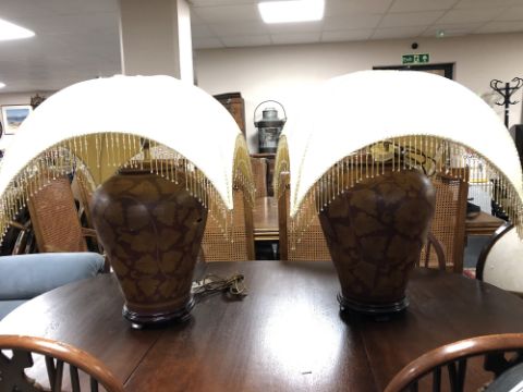 A pair of bulbous pottery table lamps on wooden bases with tasselled shades (a/f)
