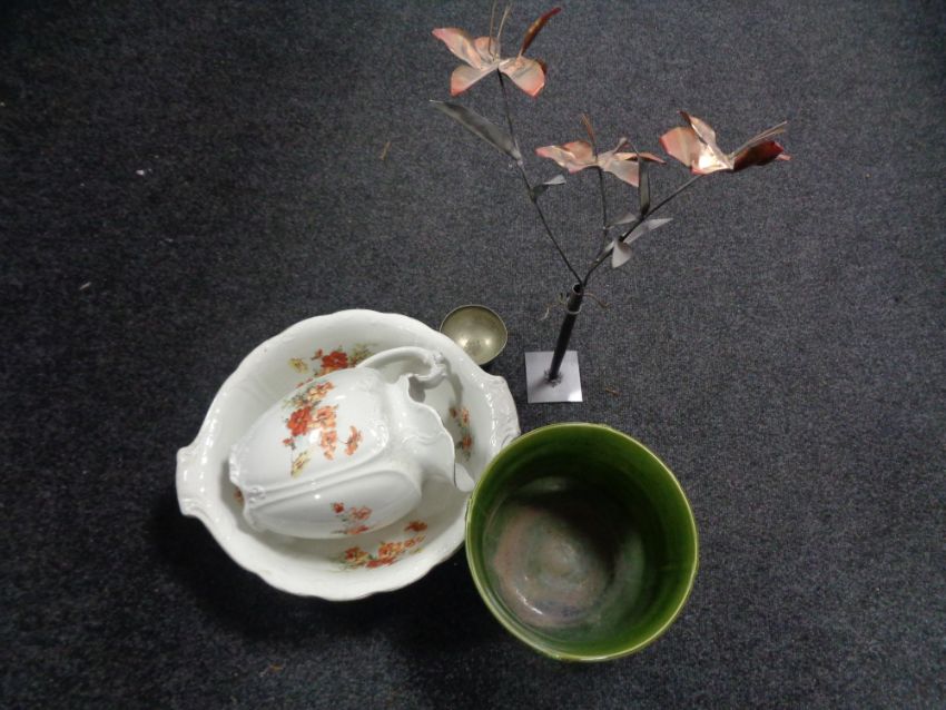 A box containing an antique transfer printed wash jug and basin, glazed pottery jardiniere, a metal sculpture of flowers, together with a plated bowl.