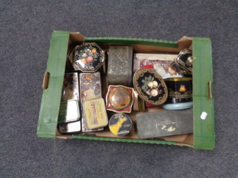 A box containing a collection of vintage tins.
