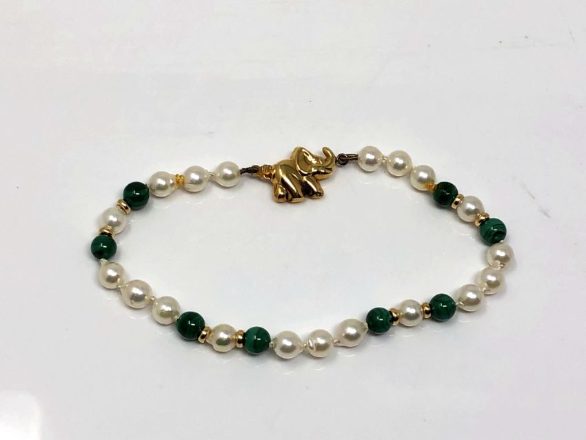 A pearl and malachite necklace with gold spaces and clasp.