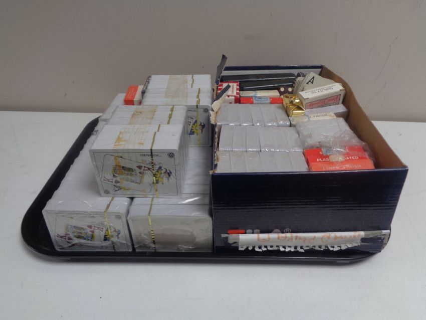 A tray containing a large quantity of playing cards and casino dice (many sealed).