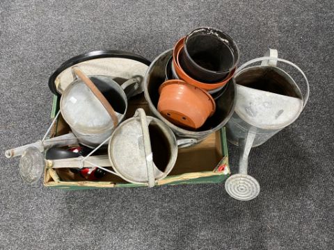 A box containing three galvanized watering cans together with a quantity of plastic plant pots.