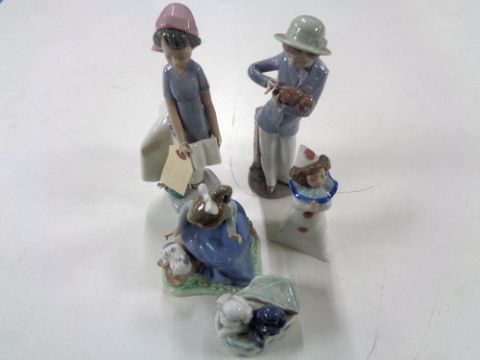 Five Nao figures to include girl with book, girl with puppy, puppies in basket, clown, and girl seated with puppy (as found).