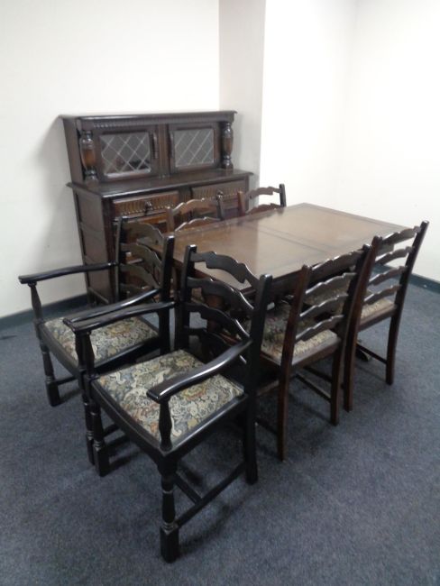 An eight piece dining room suite comprising of buffet back sideboard, refectory extending table and six ladder back chairs