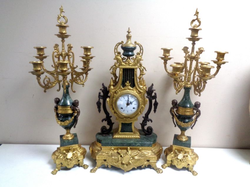 An ornate highly decorative brass and marble three piece Imperial clock garniture.
