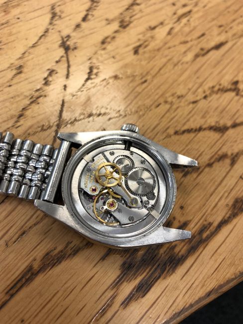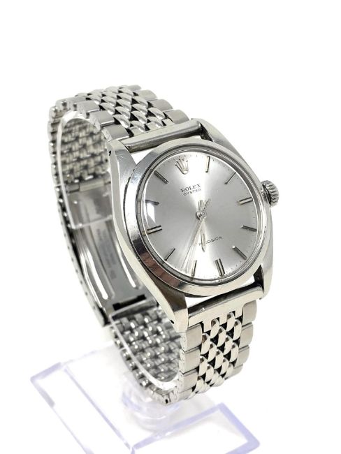The watch is in good condition. It winds smoothly and runs. The stem of the crown has a little bit of a wobble to it when turned but it appears to be functioning fine. The dial is quite clean save for a small patch of dirt/discolouration just beneath the 'e' of Oyster. Case and glass with all-over fine surface scratches, commensurate with age and use. The bracelet is stamped 'Maruman Japan' and the links appear to be in good condition. There are some small flecks of dirt within the movement.