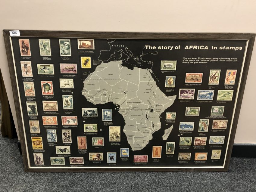 A colour print depicting the story of Africa in stamps, 92 x 62 cm, framed.