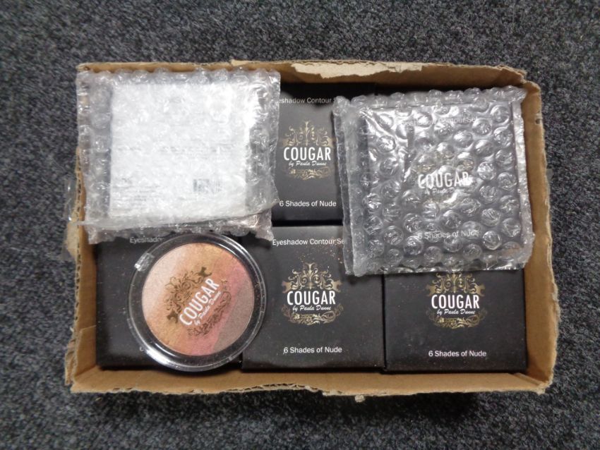 A box containing Cougar by Paula Dunne eye shadow palettes (new).