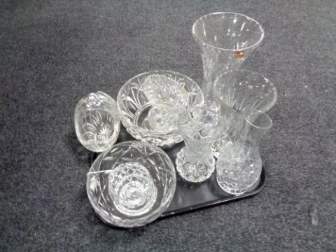 A tray containing 20th century cut glass vases, bowls, basket etc.