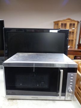 A Kenwood microwave together with a Hitachi 26'' LCD TV.