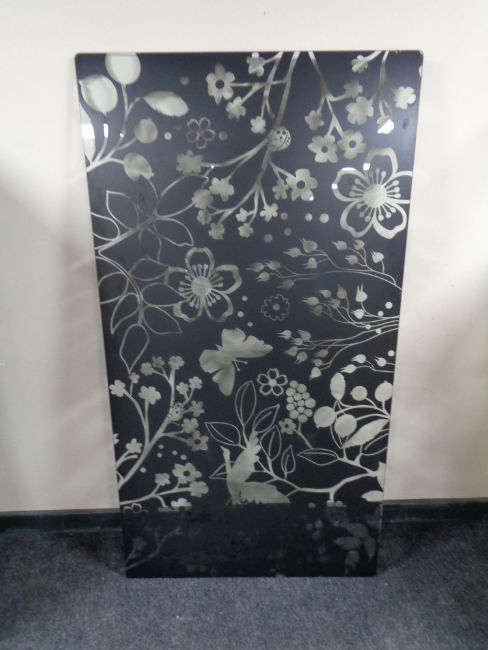 A glass panel depicting flowers and insects