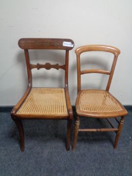 An antique brass inlaid bergere seated bedroom chair together with one other