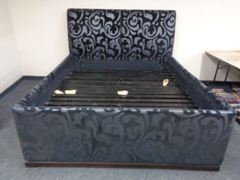 A 6ft bed frame upholstered in a black and silver fabric.