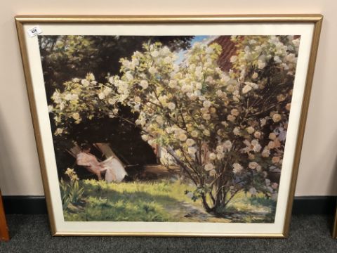 A continental colour print depicting a rose garden, 83 x 76 cm, framed.