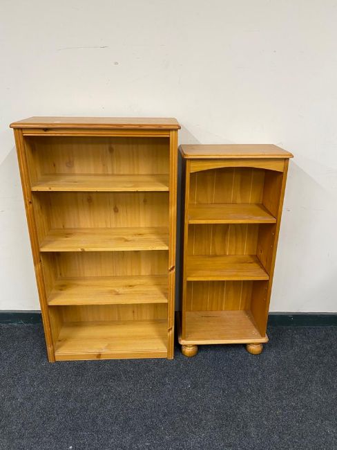 Two sets of pine open bookshelves.