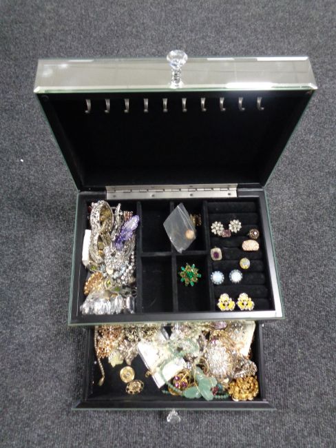 A contemporary mirrored jewellery box containing a large quantity of costume jewellery to include rings, earrings, brooches, bracelets etc