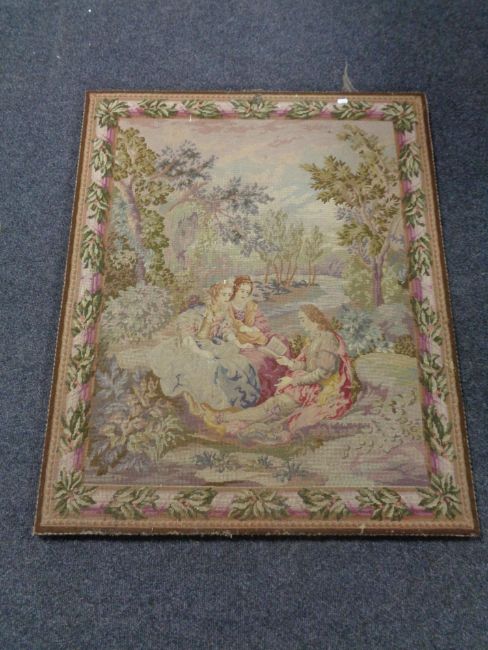 A tapestry mounted on board depicting three figures in a garden.