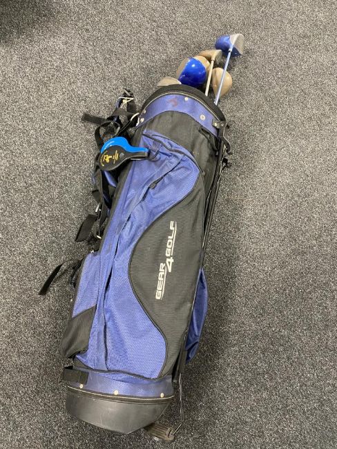 A golf bag containing five assorted drivers to include Triumph and Dunlop, three irons and two putters