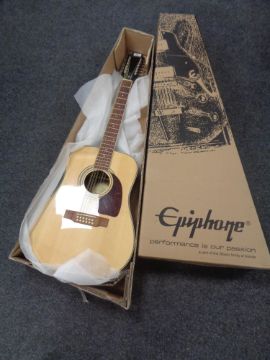 An Epiphone DR-212/N twelve string acoustic guitar, serial number 19072308862, made in Indonesia, natural finish spruce top with mahogany body and neck, rosewood fretboard, in Epiphone box.