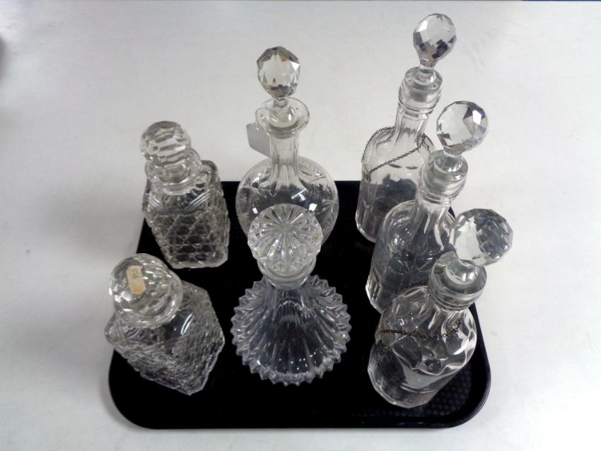 A tray containing seven 20th century glass decanters.